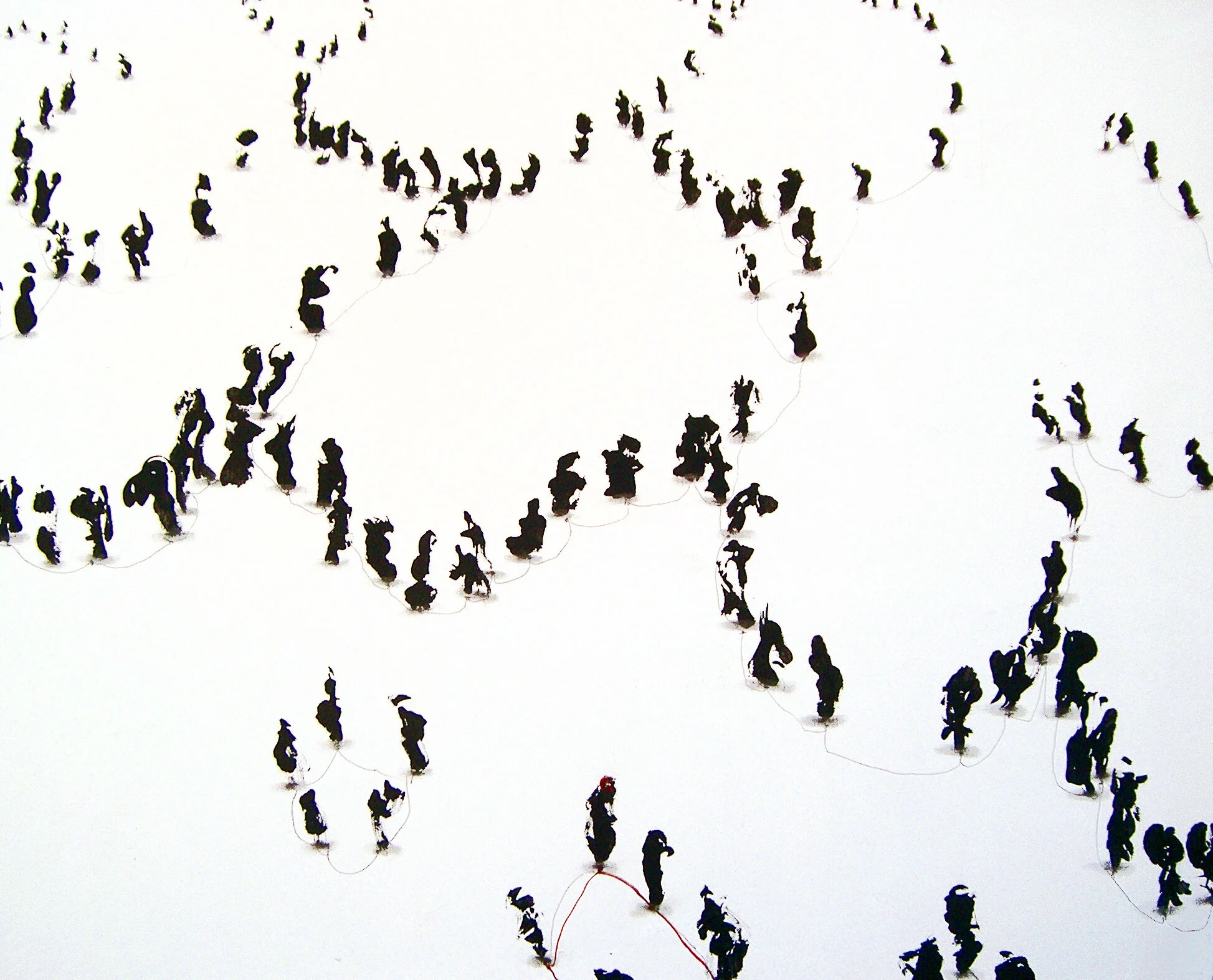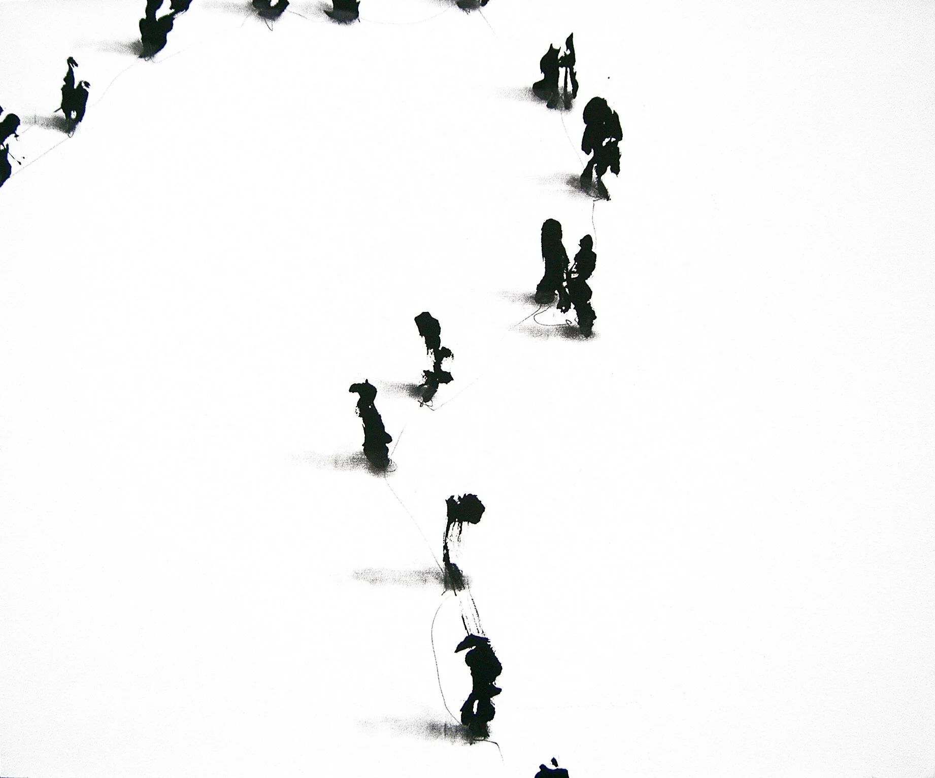 Dans Scories, l’espace vierge de la toile évoque la simplicité élémentaire de l’innomé où tout possible est contenu. De cette surface plane et abstraite se détachent en noir sur fond blanc une multitude de figures anthropomorphiques pouvant être ramenées à une entité unique : le groupe. Ces groupes confèrent à la surface de la toile une dimension figurative, échelle et perspective. Une nouvelle nature. Dans ces vides devenus espaces, lieu d’échanges et d’associations, les silhouettes se développent et sortent de l’ornière à la manière d’un hors champ cinématographique. Par delà ce que l’on perçoit, nous devinons un univers s’étendre.
